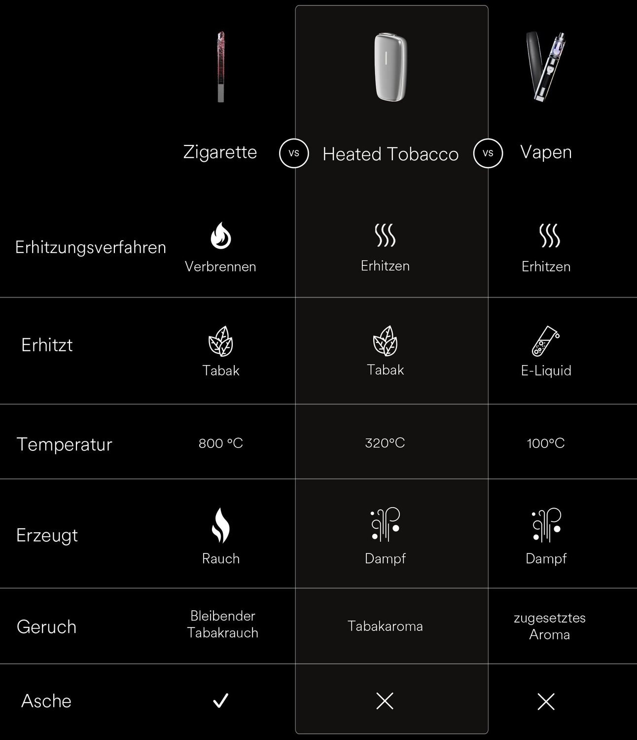Sowohl bei Heated Tobacco als auch bei E-Zigaretten findet ein Verdampfungsprozess statt. Aber während bei E-Zigaretten die aromatisierten Liquids verdampfen, wird bei Heated Tobacco das echte Tabakaroma aus den Tabaksticks freigesetzt.